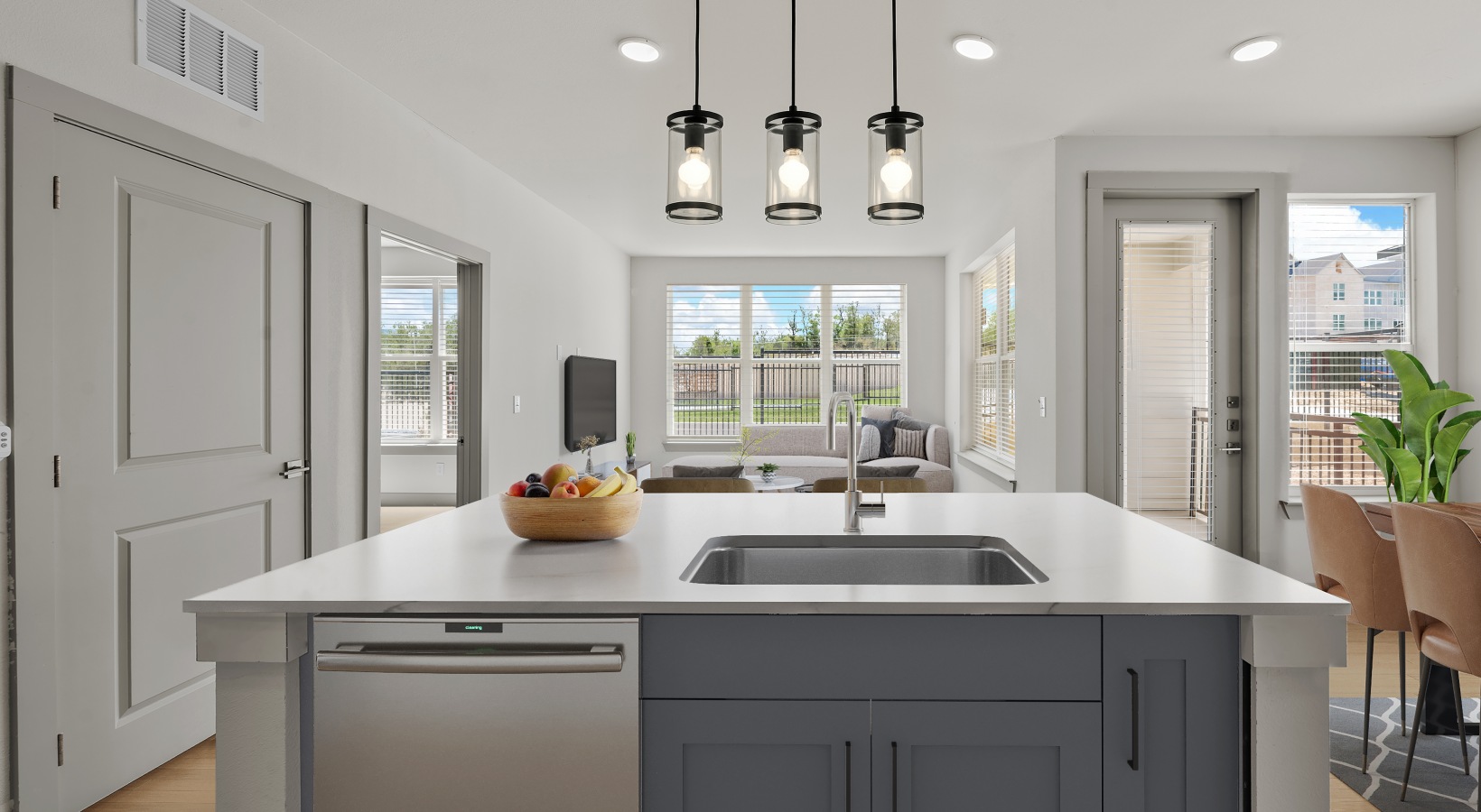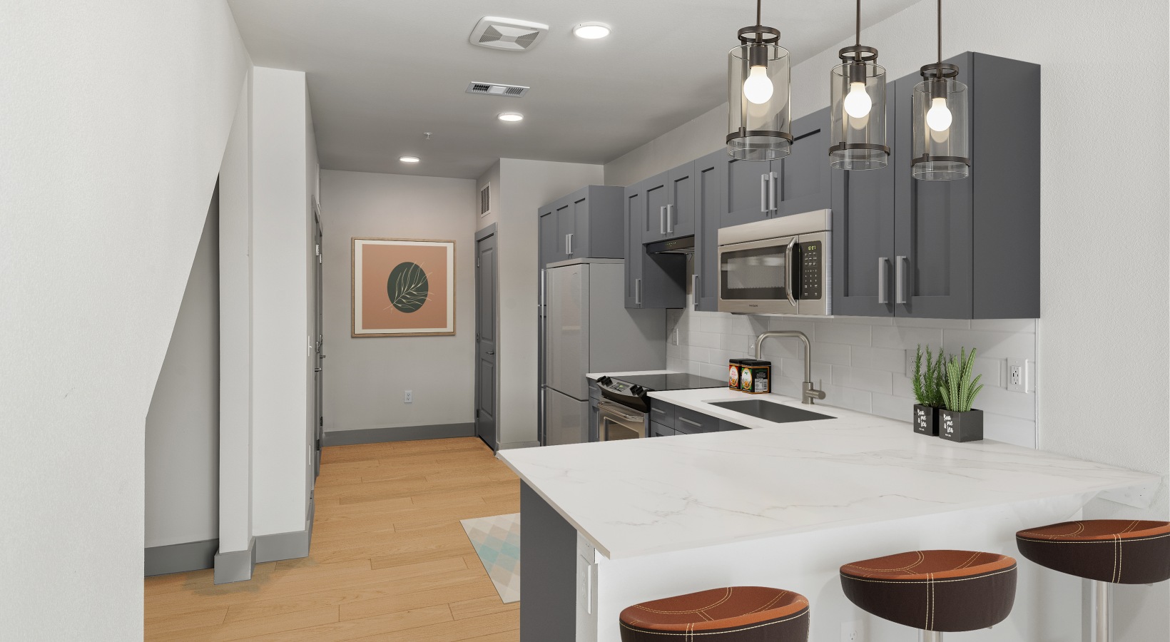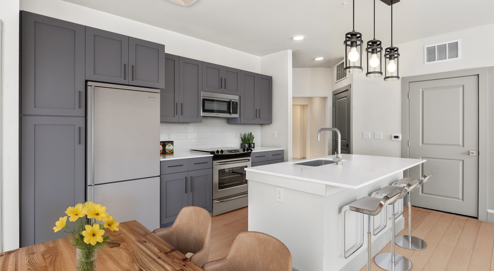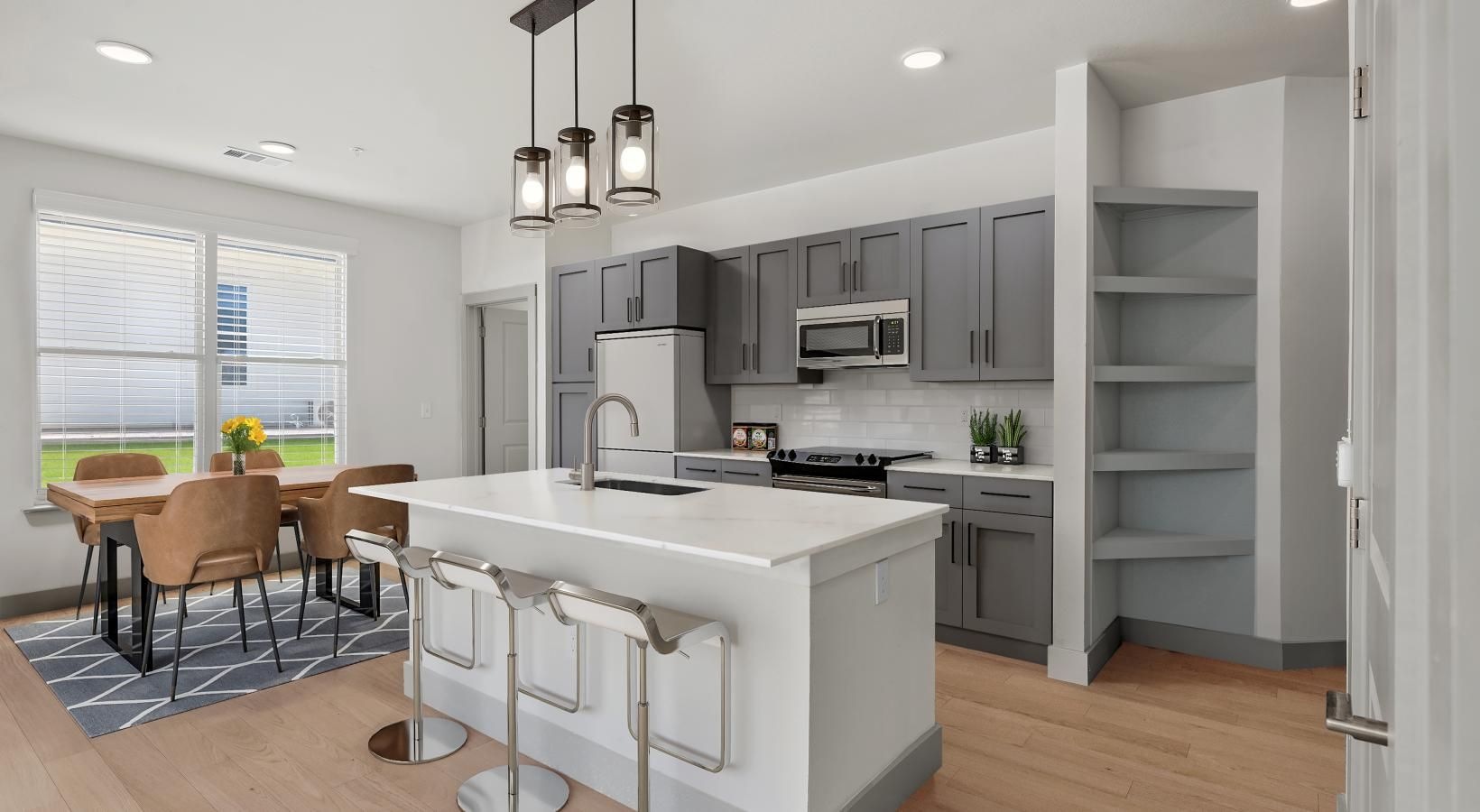 • a kitchen with a island and chairs