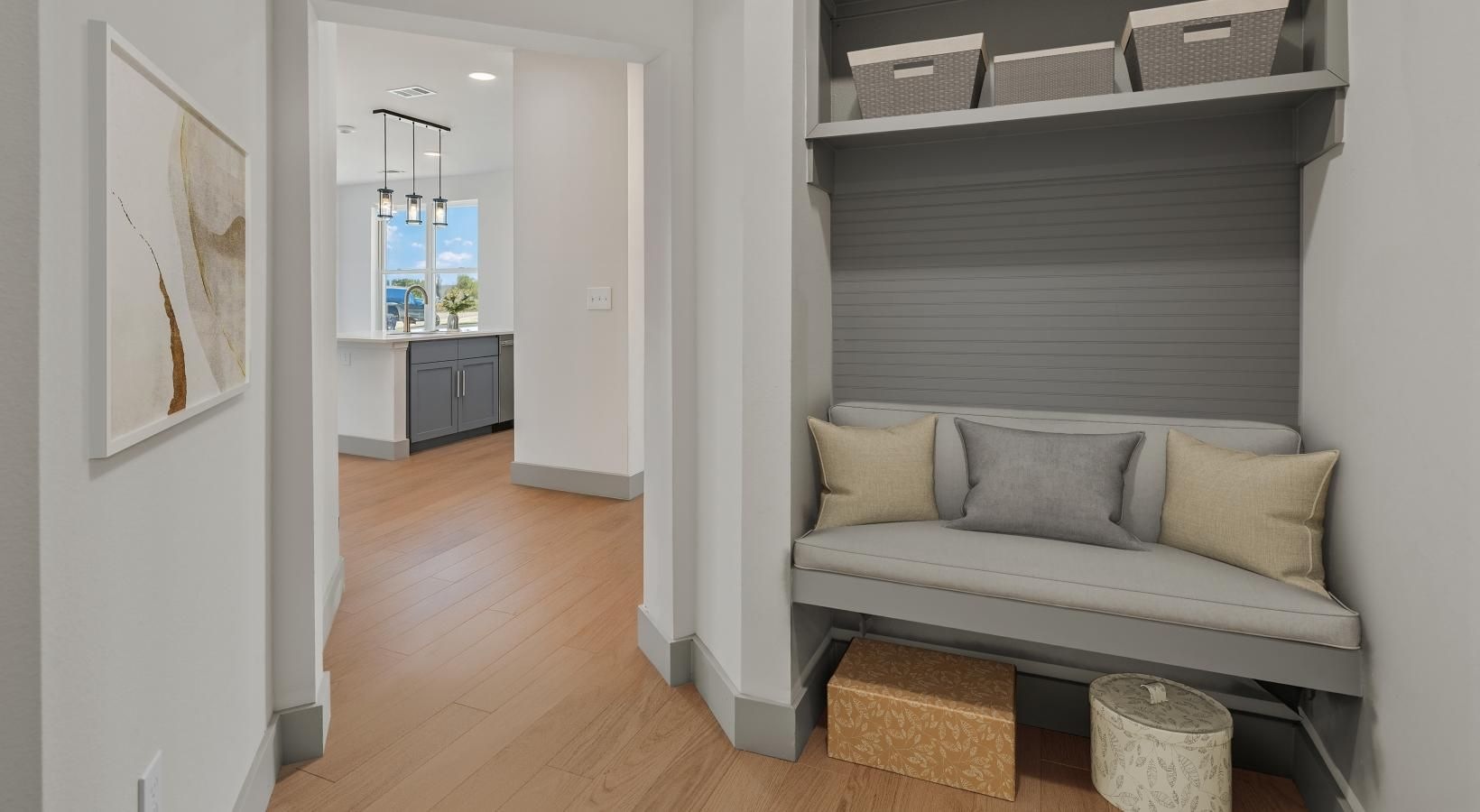 • an entryway with a bench and built in shelves