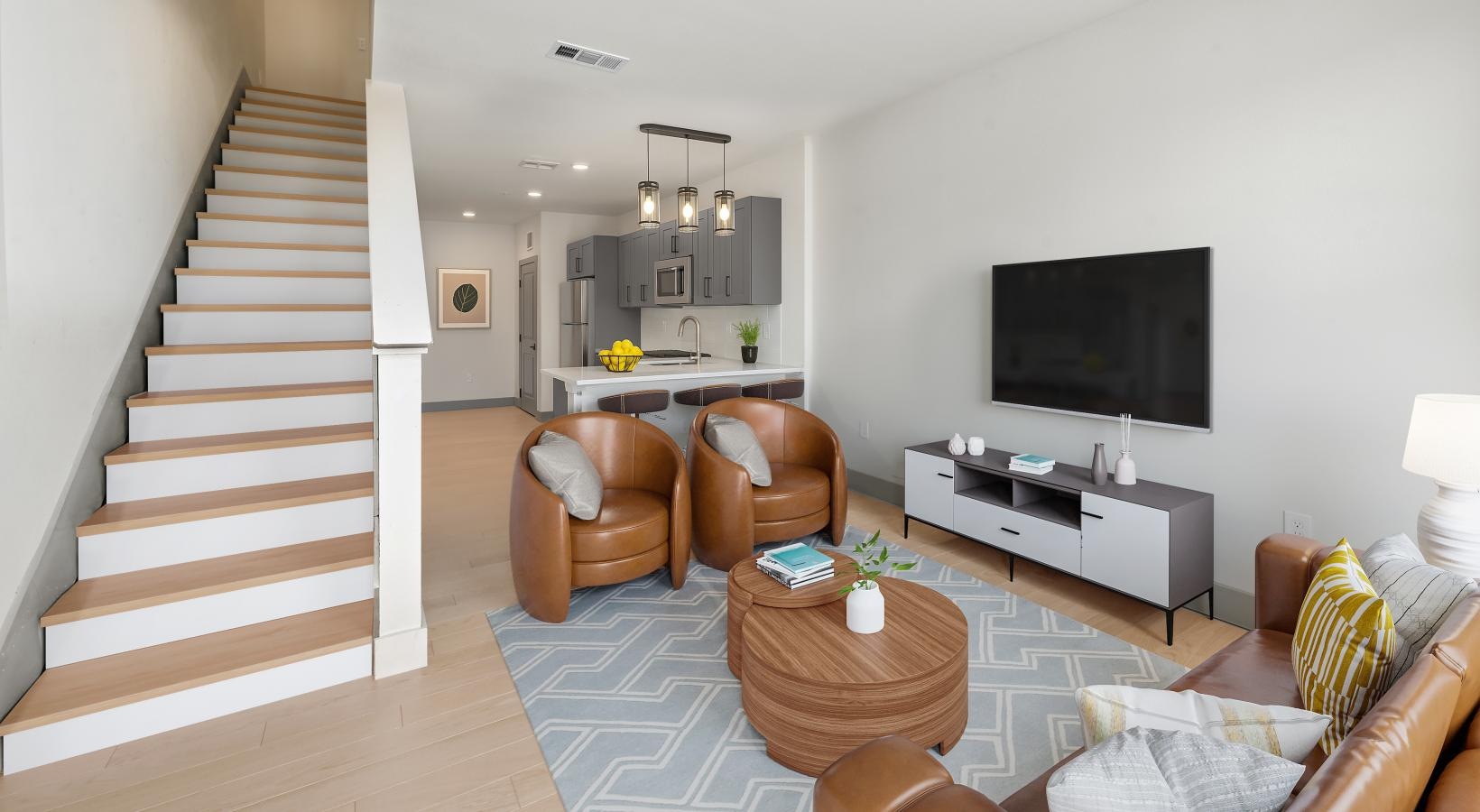 • a living room with a staircase