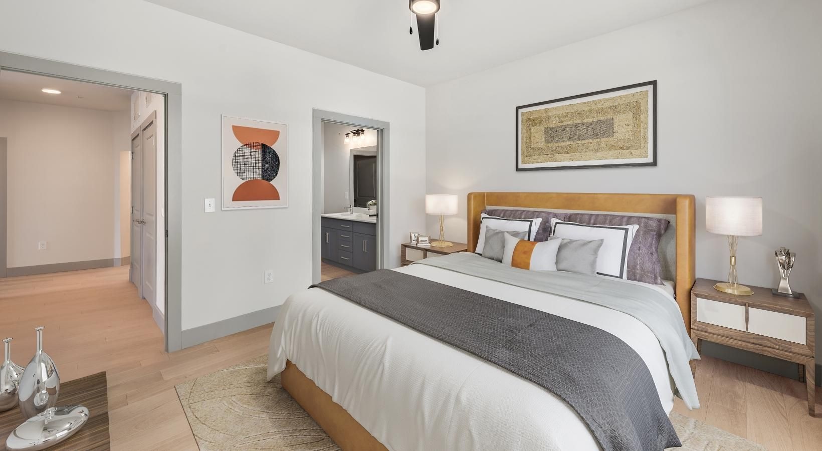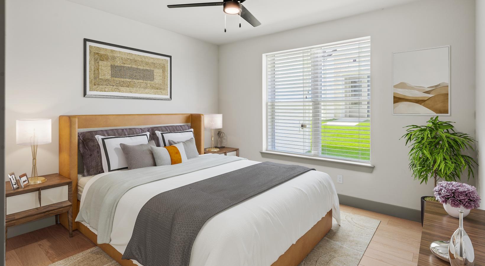 • a bedroom with a bed and a fan