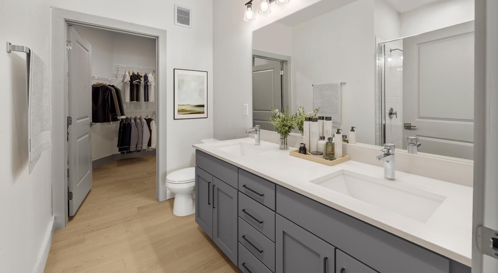 • a bathroom with a large mirror twin sinks and a toilet